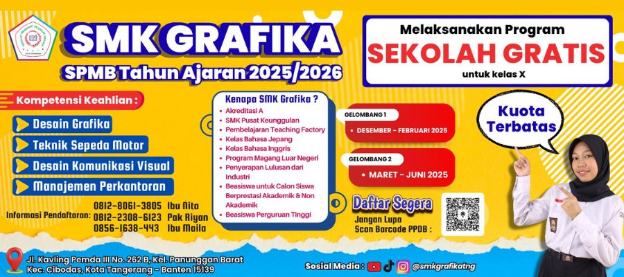 • PPDB SMK Grafika Kota Tangerang MASIH DIBUKA, Silakan Daftarkan Putra/Putri Anda untuk mendapatkan pendidikan yang BERKUALITAS dengan BIAYA TERJANGKAU. SMK Grafika